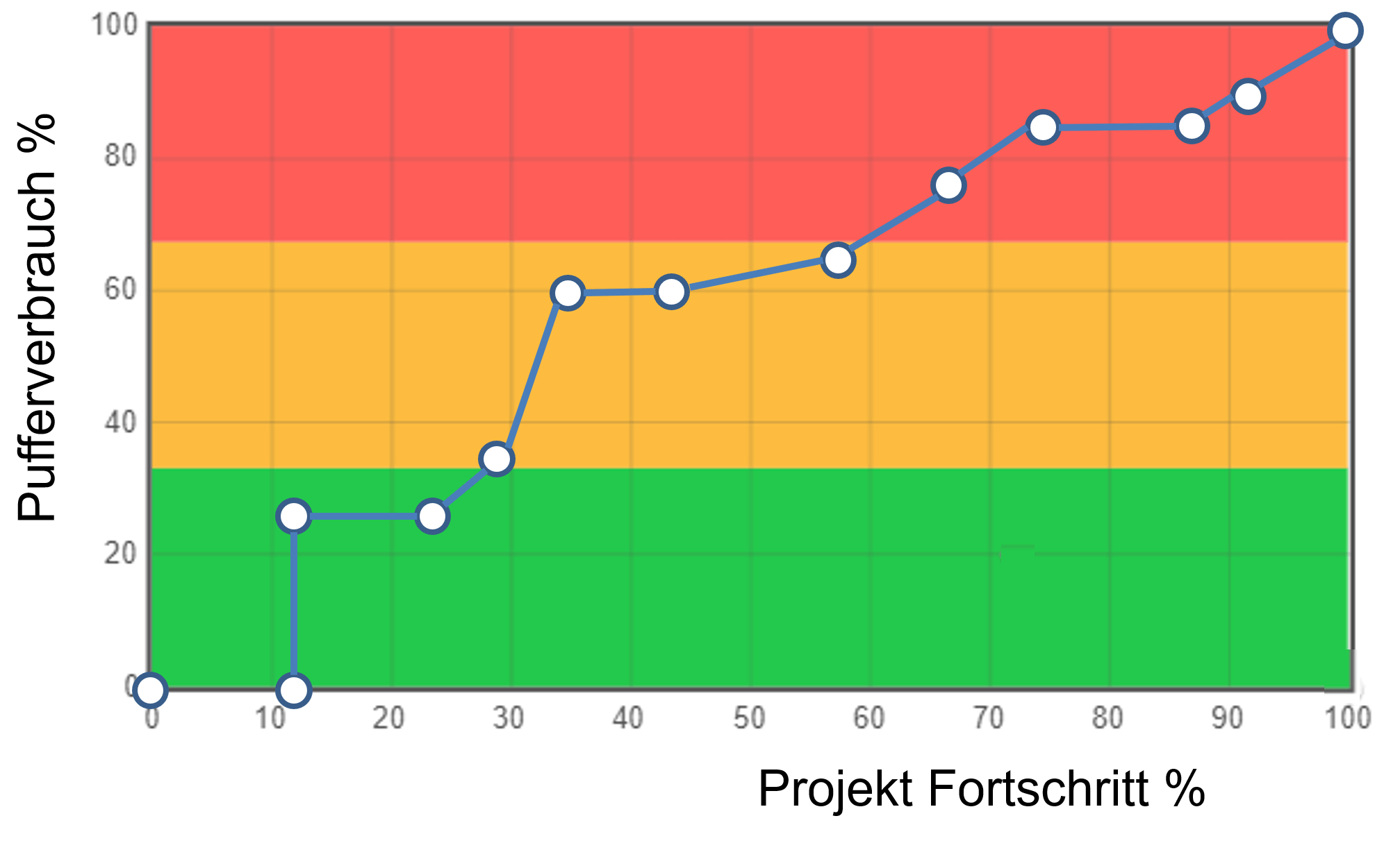 CCPM bestimmt über den Pufferverbrauch die Kritikalität jedes Projekts in Echtzeit. Über die grafische Darstellung von Pufferverbrauch zu Projektfortschritt - für ein Projekt oder das gesamte Portfolio - werden die Prioritäten intuitiv erkennbar. Projekte werden klar priorisiert und operative Handlungsanweisungen können zuverlässig abgeleitet werden. Dadurch steigt sowohl die Durchführungsgeschwindigkeit als auch die Termintreue im gesamten Portfolio.