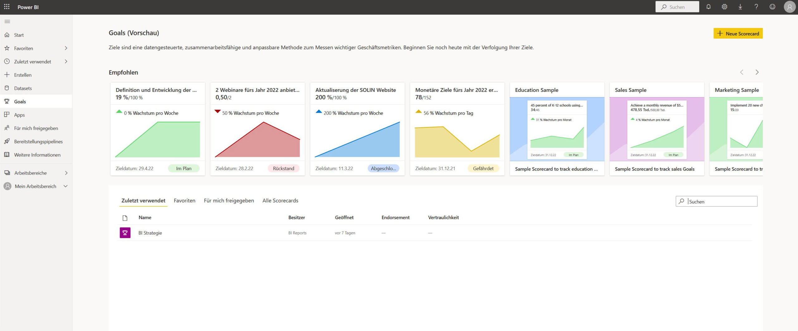 Power BI Goals ist ein neuer Bereich im Power BI Dienst und soll dazu dienen, die Unternehmens-, Team- oder strategische Ziele zu pflegen und zu tracken. Mittels unterschiedlicher „Scorecards“ können die Ziele kategorisiert oder aufgeteilt werden.
